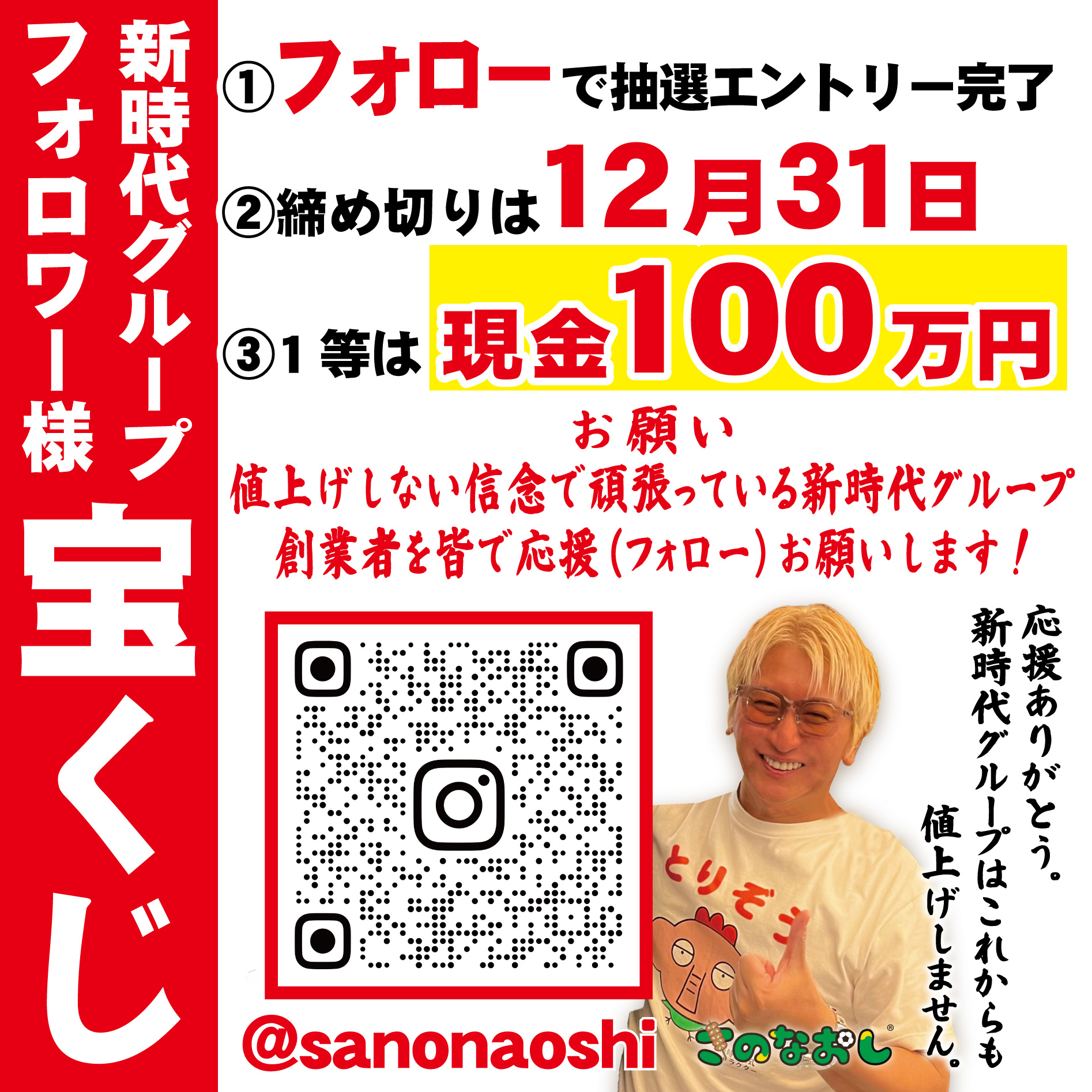 【100万円当たる】総額約120万円相当の豪華宝くじを開催 応募締め切りは2025年12月31日(水) お知らせ さのなおし その他 キャンペーン コラム 全てのニュース 2025.04.05 「値上げしない」信念を貫く新時代グループ創業者さのなおしを応援よろしくお願いいたします。 2025年12月新時代グループ創業者さの… 続きを見る